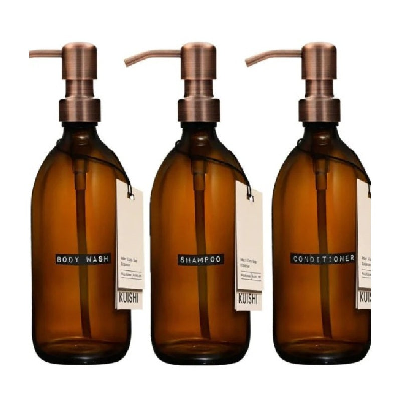 Upgrade your shower routine with this stylish and sustainable set of three refillable amber glass bottles, perfect for shampoo, conditioner and body wash.